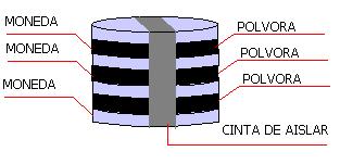 en la primera moneda, arriba de ella se le va a poner una cierta porción de pólvora.