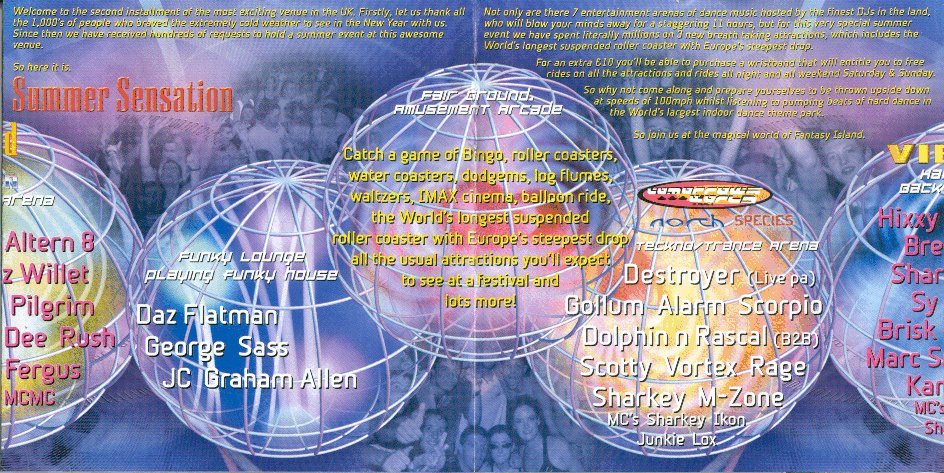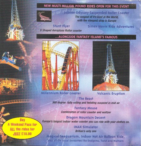 | 08/05/02 Brochure for Music Festival to be held at Fantasy Island in July, explains what rides will be open and some basic facts about the new rides. Also mentions a discounted wristband for the rides that will be available to buy for �10 |