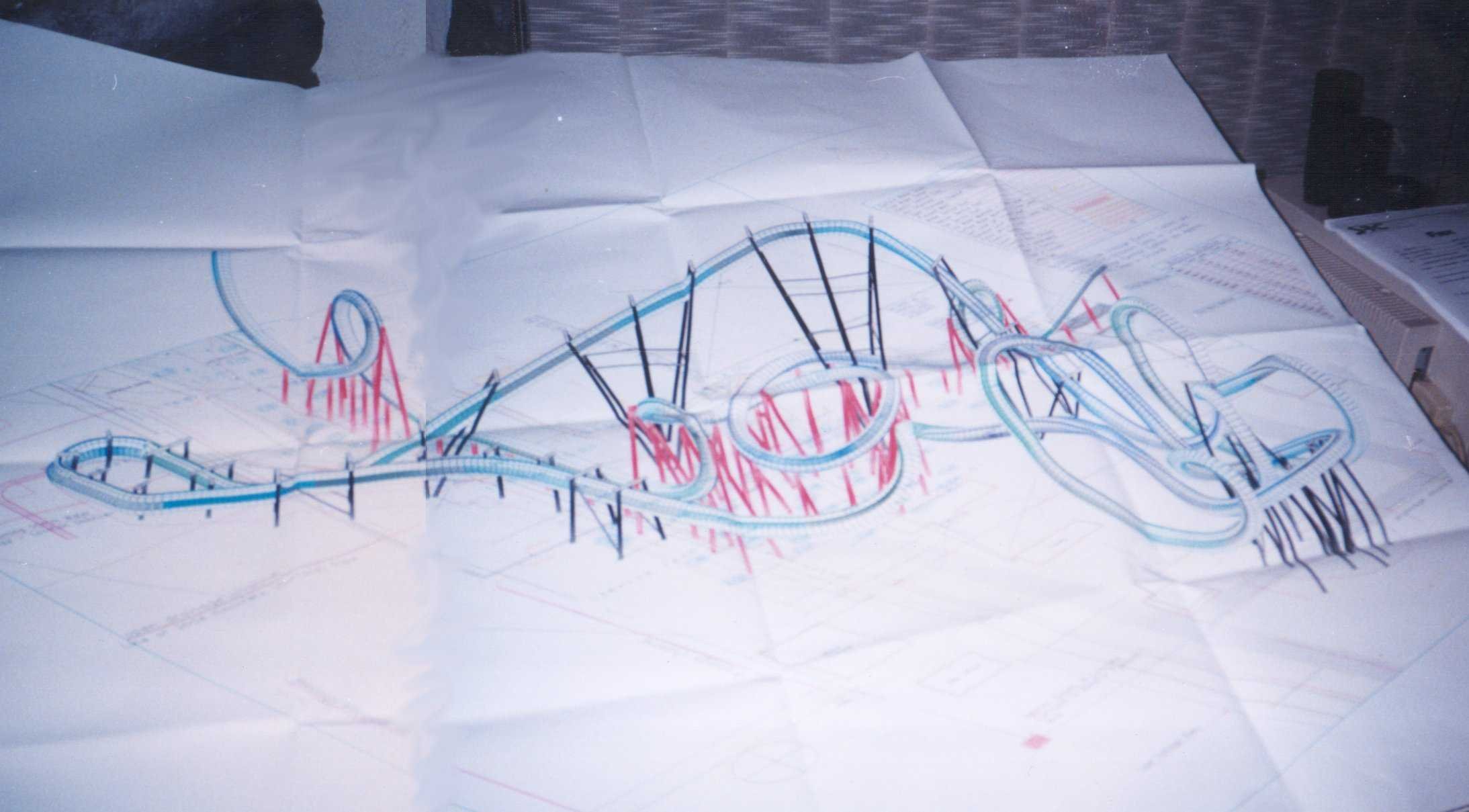 | These are the original paper plans set out by Fantasy Island, they were published in 2000 and show the ne Odyssey ride in full. The red track is of the existing Millennium Coaster and the Blue coloured track is from Odyssey, there are at least 6 inversions on the ride with some tight banked turns and it also shows the height comparison with the 2 coasters. |