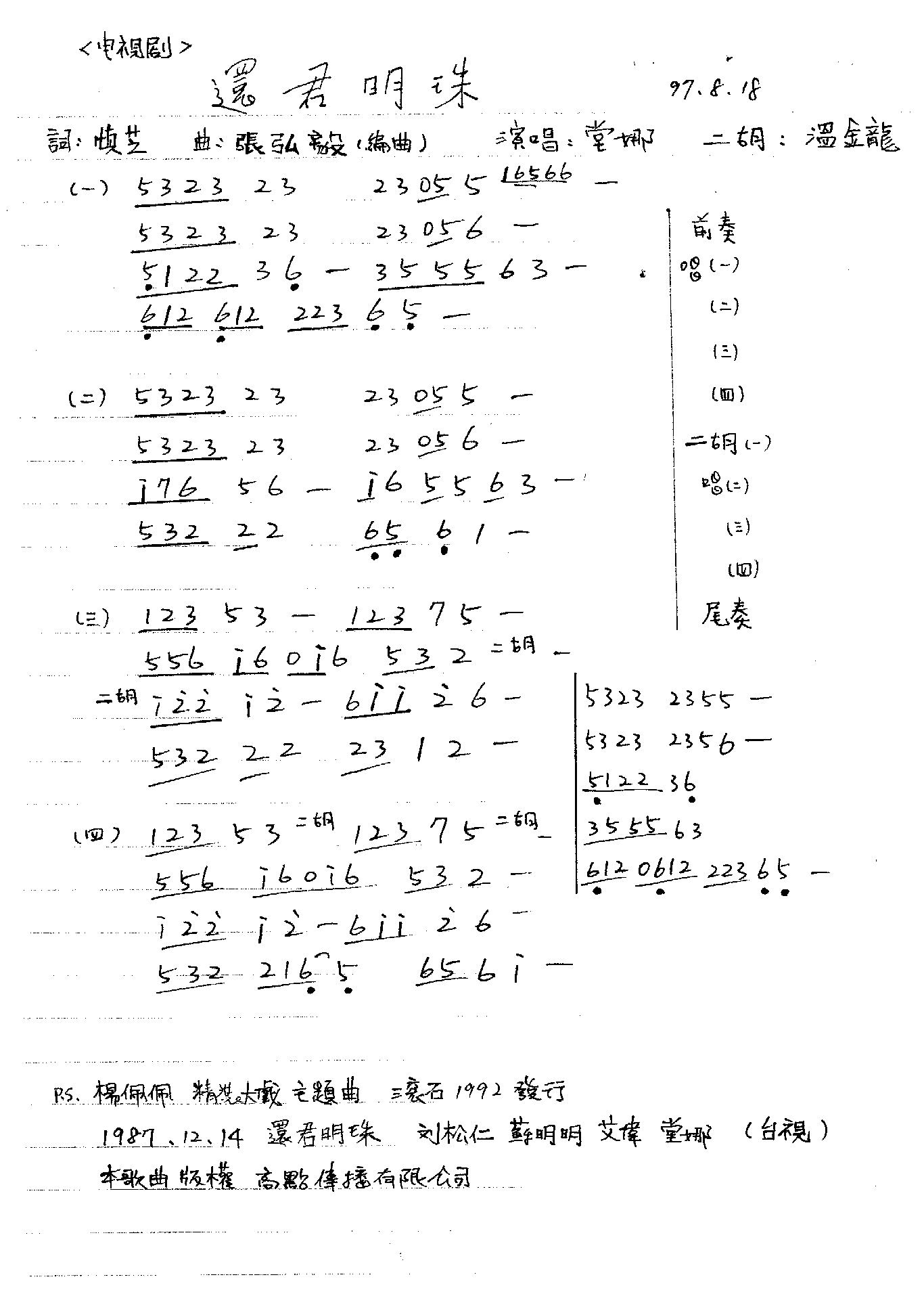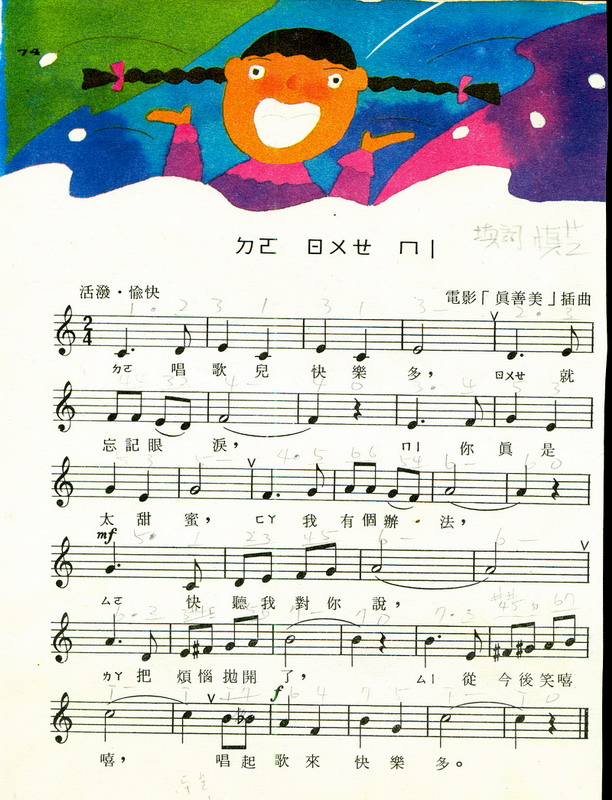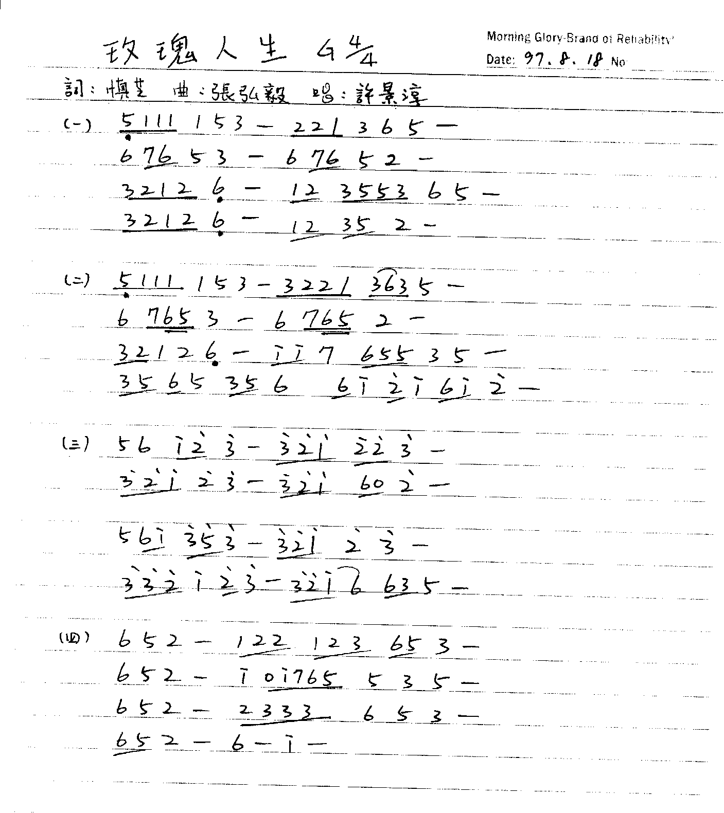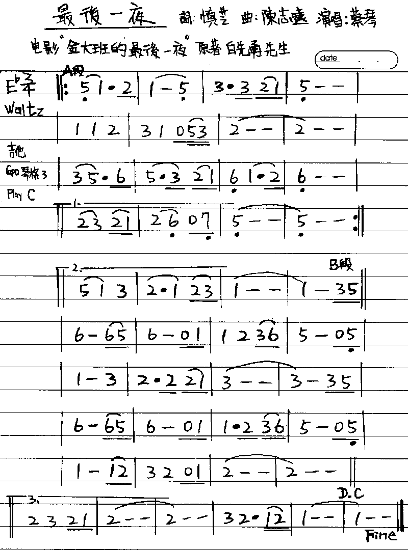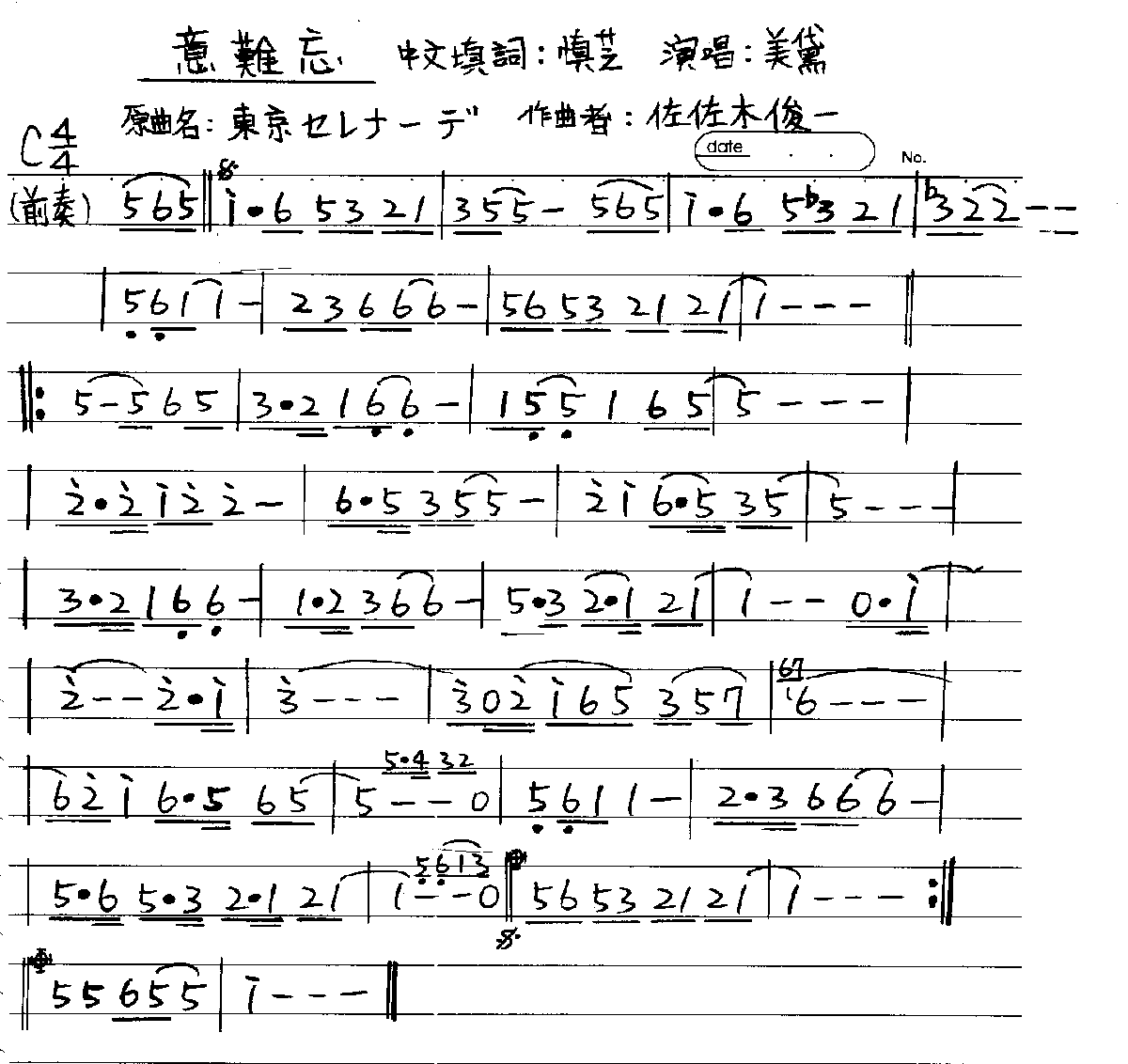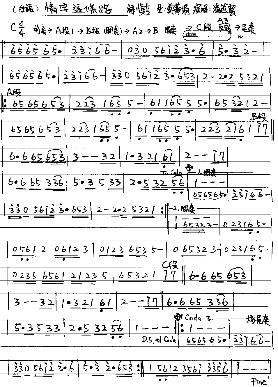 樂譜,歌譜的完整~ 是作詞者,作曲者想要表達的音樂思想, 有些受過音樂編曲的訓練, 每個樂章小節都很講究, 不像我們一般人歌唱好玩的簡譜, 雖然簡單易懂,但是~ 前奏,間奏,過門,尾奏,口白會被忽略! 手稿,樂譜是最該被保存的, 官方圖書館資料卻沒有出版業者多=.=;;; 2004.12.18(六) 站長楊+副站阿J 點選可放大 music 群星頌 22kb (懷念老歌精選2意難忘 泉源出版社) music 意難忘 28kb (參考 北國之春-日語歌曲 嗚遠出版社) music 最後一夜 22kb (參考 校園民歌-國語流行歌曲 立誼出版社) music 還君明珠 44kb (夥伴抓音 ps.二胡並不確定演奏者) music 玫瑰人生 35kb (夥伴抓音) music 情字這條路 38kb (參考 潘越雲演唱經典 滾石文化出版社) music 榕樹下 157kb (參考 北國之春-日語歌曲 嗚遠出版社) music DoReMi 171kb (台灣教育廳國民小學音樂課本 約1978年國立編譯館出版) |