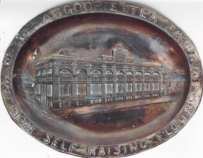 An advertising change tray featuring a representation of D. & J. Fowler's Lion Factory on North Tce, Adelaide. 1920s
