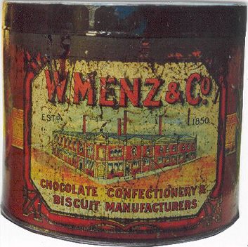 Old style Menz Chocolate, Confectionery and Biscuit tin, displaying an unofficial, Pre-Federation coat of arms.