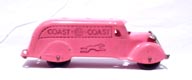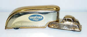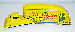 | 2 examples of Grimland toy trucks, the "Toys That Last." Not much is known about these 1940's era toys which were most likely given away to distraught children on moving day. But did you know Grimland toys were produced variously in Marietta, Georgia & Jacksonville, Florida? And did you these toy trucks bear a strong resemblance to a real truck manufactured by White in 1938? The most commonly found examples of Grimlands are the orange/black schemed Allied and red/blue schemed Grey Van Lines trucks. The gold Grey Van Lines above is the only one I have seen in this color, and I also have a silver Grimland salesman's promo. Also did you know that the "Al" Naish trucks are very rare originals? Al Naish has been in business since about 1927, and I have seen 4 of these toys. However I suspect ole Al made them instead of the Grimland factory. |