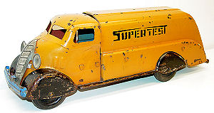 | Ultra rare Marx Supertest gasoline truck. Currently only 1 of 2 known to exist. Supertest is a defunct chain of Canadian gasoline stations. The graphics on this Studebaker-style truck appear to have been privately produced and likely was not a factory piece. |