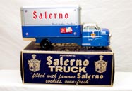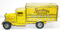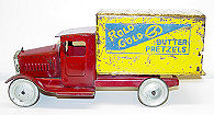 | 1930's Metalcraft advertising trucks- CW Coffee Wrecker, Kroger Food Expresss; rare Tag Soap & Werk's Tag Soap; Sunshine Biscuits stake and van trucks; Meadow Gold Butter & Rold Gold Pretzels. From 1931 to about 1938 the Metalcraft Corp of St Louis produced some of the most rare & sought after advertising toy trucks. |