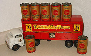 | Extremely rare original 1950's Structo "Rheem Fibre Drums" advertising truck with original fibre drum banks. Known for water heaters & furnaces, Rheem began operation in 1927 as a supplier of packaging to the petroleum industry. The toy apparently was exclusive to Rheem employees and originated from a former Rheem district manager. This is the only one of these I have ever seen in any condition. |