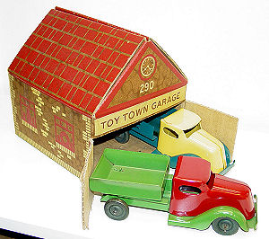 | Ultra Rare Turner Toy Town Garage set with #90 Dump truck and #97 Stake truck. Circa 1939/40, the set was acquired from an estate in Canada. Turner made several garage sets, but this one is not listed in either the Myers Turner guide nor the Freed guide. Trucks are an exact fit inside the cardboard garage. Currently it may be the only one still in existence. |