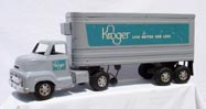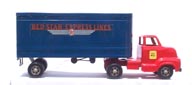 | The first Dunwells were made in 1954 or '55 by Dunwell Metal Products Co. in Clifton NJ, and sometime later by the Fame Metal Products Co in Newark, NJ. It is believed the 1953-58 Dunwell Kroger truck pictured above was only available to store manageres. Dunwell produced several other advertising trucks including the Snowcrop Frozen Foods and Land-O-Lakes trucks. But did you know that in 1959 Ohio Art began selling Dunwells under the trade name Buckeye? There are slight differences between the two, with the most noticable distinction being the use of single instead of dual rear axles. Pictured above is the Buckeye Red Star Express Lines truck. |
