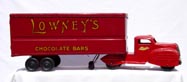 | 9 examples of 1940's-50's Canadian-made Lincoln trucks. Lincoln toys were made in Canada from 1946-1959, and this classic style Lincoln was first produced around 1947-48. TOP ROW L-R: Woodward's advertising trailer truck, Lincoln Coca Cola truck with 12 wood cases, and 1947 "Tow Truck." MIDDLE ROW: 40's Lowney's Chocolate Bars advertising truck, Sanitation Truck, and a 16" "Tow Truck" from about 1958. BOTTOM ROW: Trans Canada Highway Express, Borden's Milk; and Ice Delivery trucks. Some Lincoln toy trucks were actually made by Ellwood Toys. Ellwood also made automotive parts and later purchased Lincoln dies when Lincoln went out of business. |