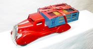 | If the Boomaroo story above isn't enough, here's more evidence that Marx truly was the World Pooh-Bah of toy makers. The 2 trucks pictured above originated from England, but did you know they were made by Marx? The 1930's "Lorry" pictured on the left is a classic early Type 1 Marx design, and has the same wheels and trailer found on some Girards. Marx took over Girard in 1934. The Lumar Construction Co truck on the right is marked with the classic Marx logo and states it was made in Great Britain. "Lumar" (derived from Louis Marx) was also a Marx trade name. |