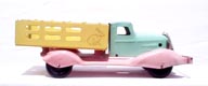 | Late 1930's to early 1940's Easter-style trucks. These very scarce colorful toys were originally filled with and/or sold with candy during Easter. Most were ink-stamped with images of rabbits or chickens. Top row are late 1930's era Marx. Pictured at middle/middle is a 1935 Wyandotte stake truck with rare circus wheels. To the left and right in the middle row are a Marx tanker and a Marx stake truck circa 1937-1941. The Marx stake truck shows an unusual lavender-colored bed. Bottom row are Wyandottes ranging from 1937 to 1942. |