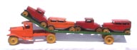 | 4 examples from Turner. Clockwise from top left: Scarce #40 Speed truck circa 1930; signature 1930's design Bulldog Mack dump truck; #585 Diamond T style Transport truck circa 1938 with rare original load of #90 Dump truck and #97 Stake truck; and 1938 Chevy-style wrecker with tool box. |