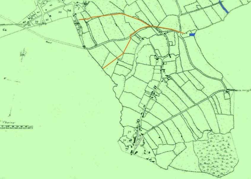 The tramroads linking the Charnwood Forest Canal are traced in gold; the canal is coloured in blue. By comparing this plan to later nineteenth century Ordnance Survey maps, we are able to identify the properties remaining in the village which are of a likely pre-nineteenth century origin. Hopefully, we will be able to add a programme which brings up the identity of buildings as the cursor is moved around with the mouse.