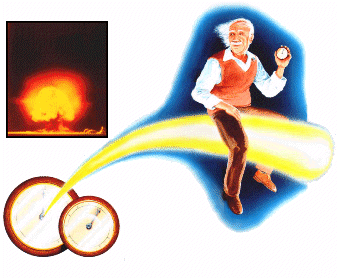 a light beam back in time Einstein loved to devise "thought experiments" to help him understand the consequences of his ideas, and it was such an experiment that triggered his insights into space and time. He is standing next to a clock, and just at the moment its hands show 12 he is whisked off on a beam of light at 300,000 kilometres a second for 300,000 kilometres. According to common sense, his journey will have taken one second. And if Einstein looks at a watch in his hand, it will indeed say one second past 12. But if he could take a look over his shoulder, the clock back at base would still say precisely 12. The reason is simple: as Einstein is travelling at the speed of light, the light rays transmitting the image of the clock with the new time of one second past haven't been able to catch up with him - while he travels at the speed of light, it will always seem to be 12 precisely. Who is right? The answer is "both" - everything, including time, is relative, and what you measure as time depends on how fast you are moving. Time "slows down" the faster you go. |