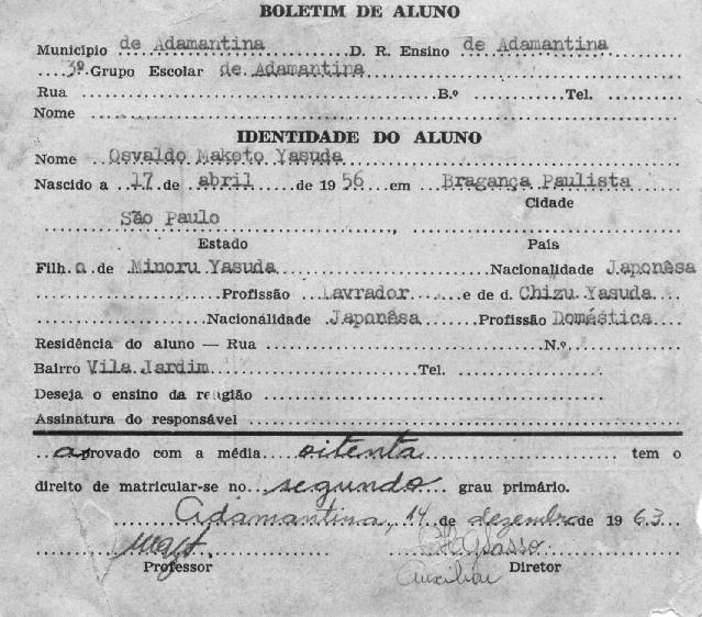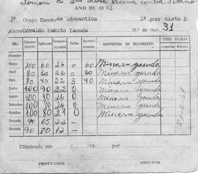 Primeiro ano primário no Terceiro Grupo Escolar de Adamantina, SP (Boletim de Aluno - Frente & Verso).