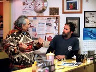 Ysidro Perez (left) and Brett Kump have a post-breakfast conversation after eating at Joe's.