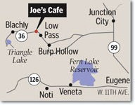 Sitting along Highway 36 between Cheshire and Triangle Lake, the tiny cafe also is the unofficial community center for people from miles around.