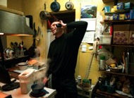 Co-owner Joe Weiler cooks up some oatmeal while taking a phone call in the cafe's cramped kitchen. Joe's low-key, friendly attitude has made the restaurant a welcoming place for locals as well as outsiders.