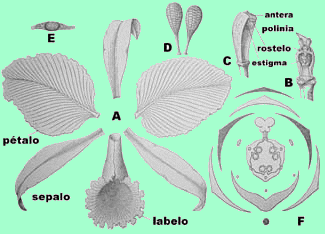 | A, piezas del perianto (tres sépalos, dos pétalos y el labelo: B, ginostemo