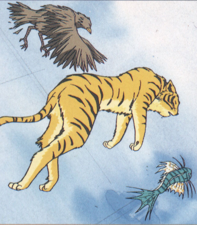 a partir de las estructuras de un pez, un halcón y un tigre, respectivamente