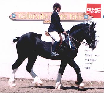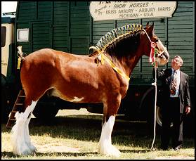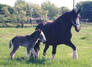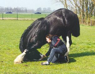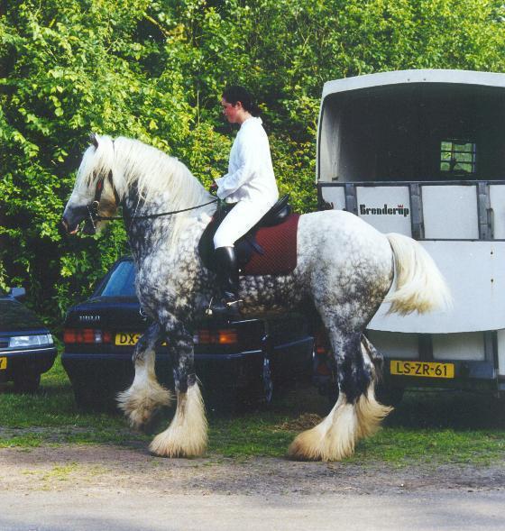 | Herkomst: Engeland Informatie en Geschiedenis: Het Shire Horse is pas in de negentiende eeuw in Engeland ontstaan en kreeg pas in 1884 zijn naam, toen de Shire Horse Society opgericht werd. De Shire stamt af van het Old Englisch Black Carthorse. Toentertijd waren de paarden van dat ras lelijk, lui en slecht gehumeurd. Echte grote en zware trekpaarden voor de landbouw en voor het trekken van zware lasten werden vooral in het midden van Engeland gefokt. Doordat bijna al deze plaatsen in het midden van Engeland op Shire eindigen, heet het ras zo. De reden voor het fokken van de Shire was dat de zware moerasgrond en klei heel erg vermoeiend waren, er moest een groot en sterk ras komen. Dat is dus inderdaad gelukt, want de Shire is het grootste en sterkste paardenras ter wereld. In het begin verschilde het ras per streek. Toen in het eind van de negentiende eeuw het stamboek verscheen, werd het fokken van Shire paarden aan regels verbonden. Vroeger werd het paard al gebruikt voor het trekken van de wagens van bierbrouwers en dat is tot op de dag van vandaag zo gebleven. De Shire is het beroemdste zware trekpaard uit Engeland. Hij komt over de hele wereld voor. Uiterlijk: De Shire heeft alle kenmerken van een koudbloed, maar dan uitvergroot. Hoofd: Het profiel is bol. Het hoofd heeft een verstandige, trotse uitdrukking. De oren zijn lang. De ogen zijn diep, vriendelijk en gevoelig. Het voorhoofd is breed en de kaak geprononceerd. Neusgaten en lippen: De neusgaten zijn wijd en heel erg groot. De lippen zijn dun en het ras lijkt aanleg te hebben voor een snor. Romp: De romp is diep en rond Hals en schouders: De hals is lang, gebogen en sterk en gaat soepel over in lange, schuine, aflopende gespierde schouders. Borst en rug: De borst is breed en diep, de rug is kort en sterk. Lendenen en achterhand: De lendenen en de achterhand zijn lang, gespierd en rond met een aflopend kruis. Staart: Vol en hoog geplant Benen: De benen zijn lang vergeleken met de vroegere Shire, omdat het paard nu op grootte gefokt wordt. De benen zijn heel sterk, de gewrichten zijn breed, de pijpen vrij lang en de koten kort. Onderbenen en hoeven: Het paard heeft vel behang, de hoeven zijn rond en sterk. Kleur: De voorkomende kleuren zijn lichtbruin, donkerbruin, schimmel of zwart. Vaak heeft het paard grote witte aftekeningen Schofthoogte: De gemiddelde hoogte is 1.73 meter, maar je hebt exemplaren die tegen de twee meter aanlopen Beweging: De Shire heeft een ruime stap en een stuwende draf Karakter en Bijzonderheden: Shires hebben over het algemeen een geduldig, vriendelijk, goedmoedig karakter. Ze trekken zich weinig van het weer aan, maar zoals bijna elk paard, vinden ze beschutting in de vorm van een schuilstal voor heel slecht weer wel prettig. De paarden hebben vreselijk veel voer nodig!!! Het is dus beslist geen goedkoop paard in onderhoud. Gebruik: De Shire wordt nog steeds voor boerenwerk gebruikt, hoewel hij steeds meer verdrongen wordt door de tractor. Verder wordt hij gebruikt voor publiciteit, het is dan ook een opvallende verschijning. Na een daling van het aantal Shires in de jaren �50 wordt het ras toch weer steeds populairder. Afstamming: Old Englisch Black Carthorse Vlaamse paarden Friese paarden In Engeland gefokt zware paarden Bronvermelding: Paardenrassenencyclopedie, Susan McBane De Paardenencyclopedie, Josee Hermsen Het paardenhandboek, Judit Draper Shire links: Engelstalig: www.shirehorse.org www.shire-horse.uk www.blackforestshires.com www.geocities.com/~canshire www.angelfire.com/ca/GentleGiantShires www.shirehorsefarm.yorks.net Uw Shire Link hierbij?? Stuur me een mailtje en het wordt geregeld Terug |