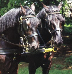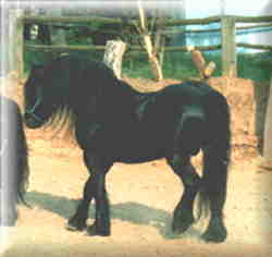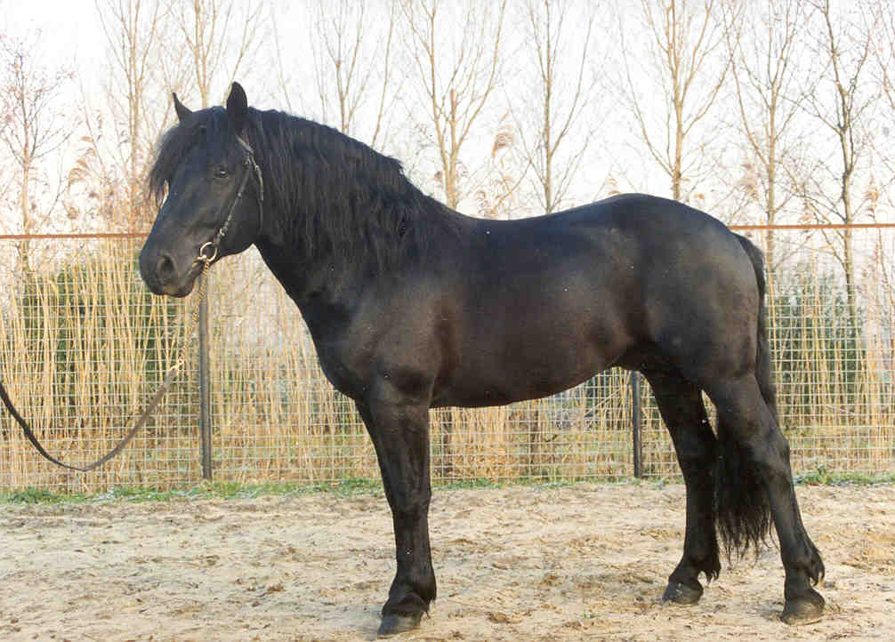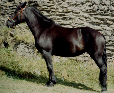 | Merens Ook bekend als: Ari�gos Herkomst: De Merens komt uit de Pyrenee�n in Zuidwest-Frankrijk. Geschiedenis en informatie: De Merens lijkt heel erg op de Zuid-Galische paarden die worden beschreven in de oorlogsverslagen van Julius Caesar. Hij komt oorspronkelijk uit de hooggelegen vallei van Ari�ge, waar de naam Ari�gos dan ook van afgeleid is. Uiterlijk: Hoofd: Licht en expressief, met vlak voorhoofd, recht profiel, vrij korte harige oren en heldere alerte ogen met een vriendelijke blik. Hals: Vrij kort en recht. Schouders: Nogal recht Rug: Lang, maar sterk Borst: Breed Achterhand: Rond met een aflopend kruis Benen: Vrij dun met een neiging tot koehakken Voeten: Goed en sterk Haar: Fijn Manen en staart: Heel dik en ruw aanvoelend Stokmaat: 131 tot 143 centimeter. In het natuurlijke leefgebied wordt de hoogte 1.43 zelden gehaald. Op rijker grasland is dit wel mogelijk. Kleur: Effen zwart. In de winter krijgt de pony een opvallende roodachtige glans. De pony heeft heel soms witte sokken of aftekeningen op het hoofd, soms heeft de Merens witte stippen op de flanken. Bewegingen: Zeer tredzeker. Met ijs bedekte bergpaden zijn geen probleem voor de Merens Karakter en bijzonderheden: De pony is best gehard en heeft het niet snel koud. Gebruik: De Merens wordt al eeuwen gebruikt als pakpony, maar het is ook een goede rijpony, of een goede hulp in de landbouw op steile hellingen waar moderne machines niet kunnen komen. Bron: Het paardenhandboek, Judith Draper Merens links: http://www.muenster.org/ig_cheval_merens/ http://www.merens.com/default.htm http://www.multimania.com/merens/histoire.htm http://www.pyrenequus.com/le%20merens.htm http://www.merens.ch/ http://www.chez.com/goodelie/races/merens/merens.html |
