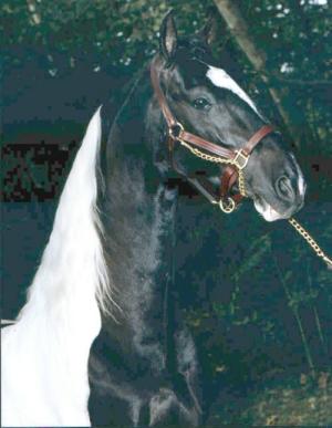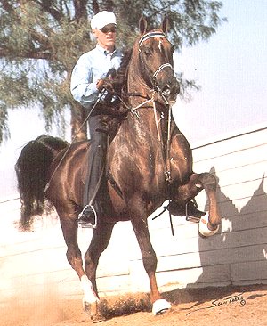 | Ook bekend als: Kentucky Saddler Herkomst De Saddlebred komt uit de Verenigde Staten Geschiedenis en informatie: De Saddlebred heeft veel gemeen met het Tennessee Walking Horse, dit paard werd ook oorspronkelijk gefokt om de plantage eigenaren op een comfortabele manier over de plantages te voeren. De Saddle Bred werd als eerste gefokt door 19e eeuwse kolonisten in de zuidelijke staten van Noord Amerika. Om aan de vraag naar een goed gebruikspaard te voldoen, fokten de plantagehouders met verschillende paardenrassen, waaronden de Narragansett Pacer en de Engelse volbloed. Het resultaat was een fraai paard met een ontspannen gang, dit was erg belangrijk voor de urenlange inspecties op de plantages. Het dier deed het ook goed voor een rijtuig. In 1891 richtte een groep vooraanstaande fokkers de American Saddlehorse Breeders' Association op en er werd een stamboek geopend. Uiterlijk: Het gehele uiterlijk is krachtig elegant en soepel. Hoofd: Edel met een recht profiel. De ogen zijn sprekend en wijduiteenstaand, de oren klein en alert en de neusgaten zijn groot en gevoelig. Hals: Gracieus gebogen, hoog gedragen en lang Schouders: Rond Schoft: Hoog en scherp Rug: Sterk Achterhand: Gespierd Kruis: Vlak Benen: De benen zijn droog en recht met sterke pezen en gewrichten. De koot is lang en schuin Hoeven: Goed en gezond, open aan de hiel Staart: Wordt zeer hoog gedragen. Kleur: De kleuren die meestal voorkomen zijn bruin, zwart of vos, het paard heeft vaak aftekeningen en alle andere kleuren komen ook voor. Hoogte: Tussen de 1.50 en de 1.70 meter Beweging: Het paard toont zeer veel actie, de gangen zijn verzameld en precies, het paard lijkt als het ware te dansen. De bewegingen zijn zeer apart, stuwend en hoog en ruimgrijpend. De stap is springerig, de draf zeer verheven en de galop langzaam, vloeiend en ritmisch. Het paard heeft twee extra gangen, de Slow Gait en de Rack. De Slow Gait is een hoge stap, waarbij de vier voeten op een trage, ingehouden wijze worden verzet. De rack is een snelle, flitsende vier tempi gang, waarbij elke voet de grond raakt met gelijke aarzeling. De gang is vrij van laterale of drafbewegingen. De Saddlebred heeft ook springvermogen. Karakter en bijzonderheden: De American Saddlebred is een heel fijn rijpaard, met een vriendelijk, intelligent, levendig karakter. Verder is het paard is hard, sober en snel, heeft een flink portie uithoudingsvermogen en een natuurlijke balans. Hij is makkelijk te beleren. Gebruik: De Saddlebred kan gebruikt worden voor vele doeleinden, waaronder het werken met vee. Ook als recreatiepaard is hij geschikt, maar hij wordt het meest gebruikt voor shows onder het zadel en in het tuig. Interessante feiten: Speciaal voor keuringen worden de hoeven onnatuurlijk lang gelaten en beslagenmet zware ijzers, de staart wordt geopereerd waardoor een onnatuurlijk hoge stand wordt verkregen. Bron: De paardenencyclopedie, Jos�e Hermsen Het paardenhandboek, Judith Draper Saddlebred links: Engels http://www.american-saddlebred.com/ http://bluebonnetfarm.com/ http://www.geocities.com/Heartland/Acres /3660/ironbark1.htm http://longgreylinefarm.com/ http://www.windwalkersaddlebreds.com Uw Saddlebred link hierbij?? Stuur me een mailtje en het wordt geregeld Terug |