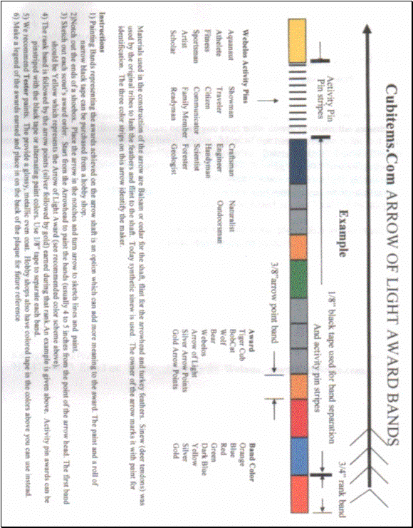 Each one of the boys will be presented with a Plaque containing an Arrow of Honor given by the Pack. This arrow will help them to remember the fun and hard work they had as a Cub Scout. The colored stripes painted on the arrow honor the individual ranks earned by each boy. Orange is for Tiger, Blue is for Bobcat, Red is for Wolf, Green is for Bear, Dark Blue is for Webelos. Yellow is for the Arrow of Light. Silver is for the Silver Arrow Points and Gold is for the Gold Arrow Points.