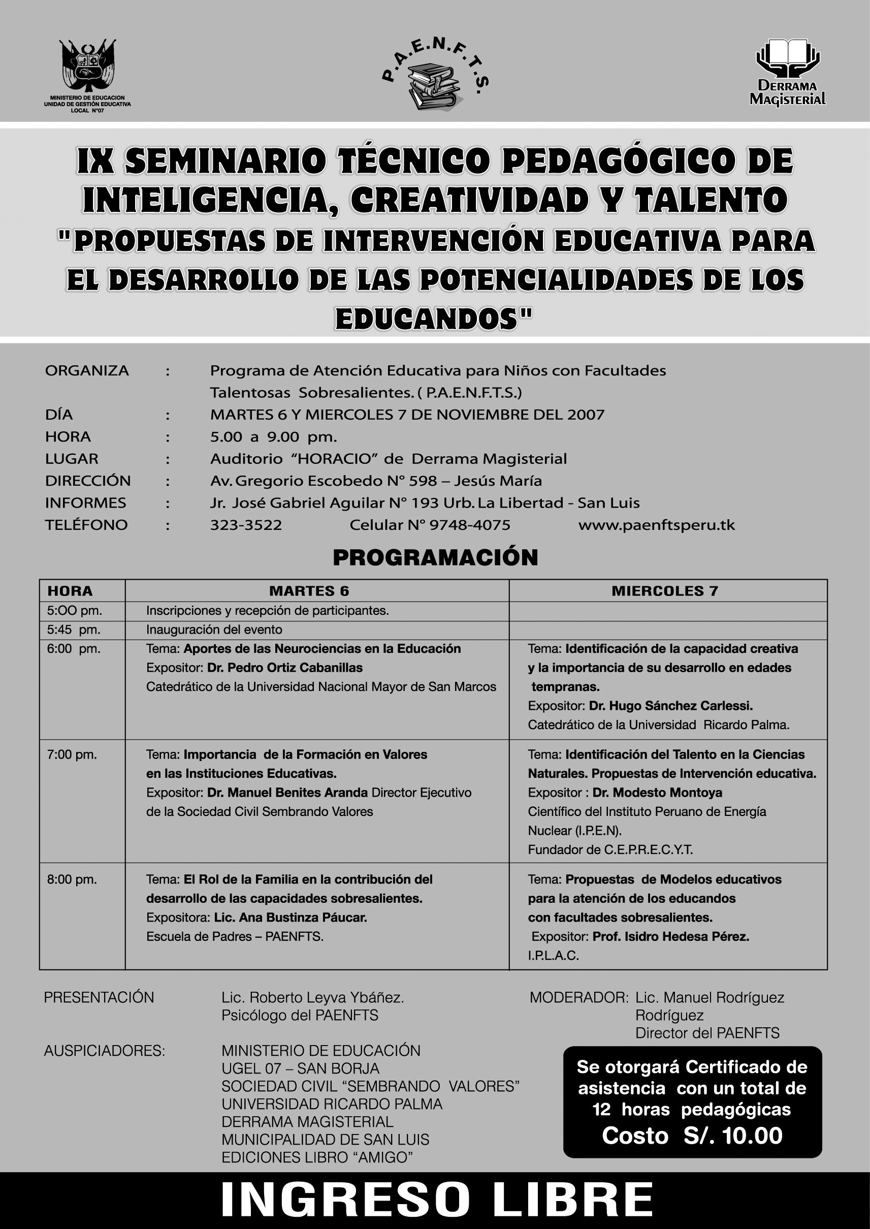 Culminó con mucho exito el IX SEMINARIO DE INTELIGENCIA CREATIVIDAD Y TALENTO con el lema " PROPUESTAS DE INTERVENCION EDUCATIVA PARA EL DESARROLLO DE LAS POTENCIALIDADES DE LOS EDUCANDOS" " una experiencia pionera en el Perú" la asistencia de los parrticipantes fue un lleno de bandera 436 inscritos. *Platea y mezanine del auditorio de la Derrama Magisterial totalmente llenas. Los ponentes trataron los temas con mucho profesionalismo.Se abordaron el temas muy interesante como: