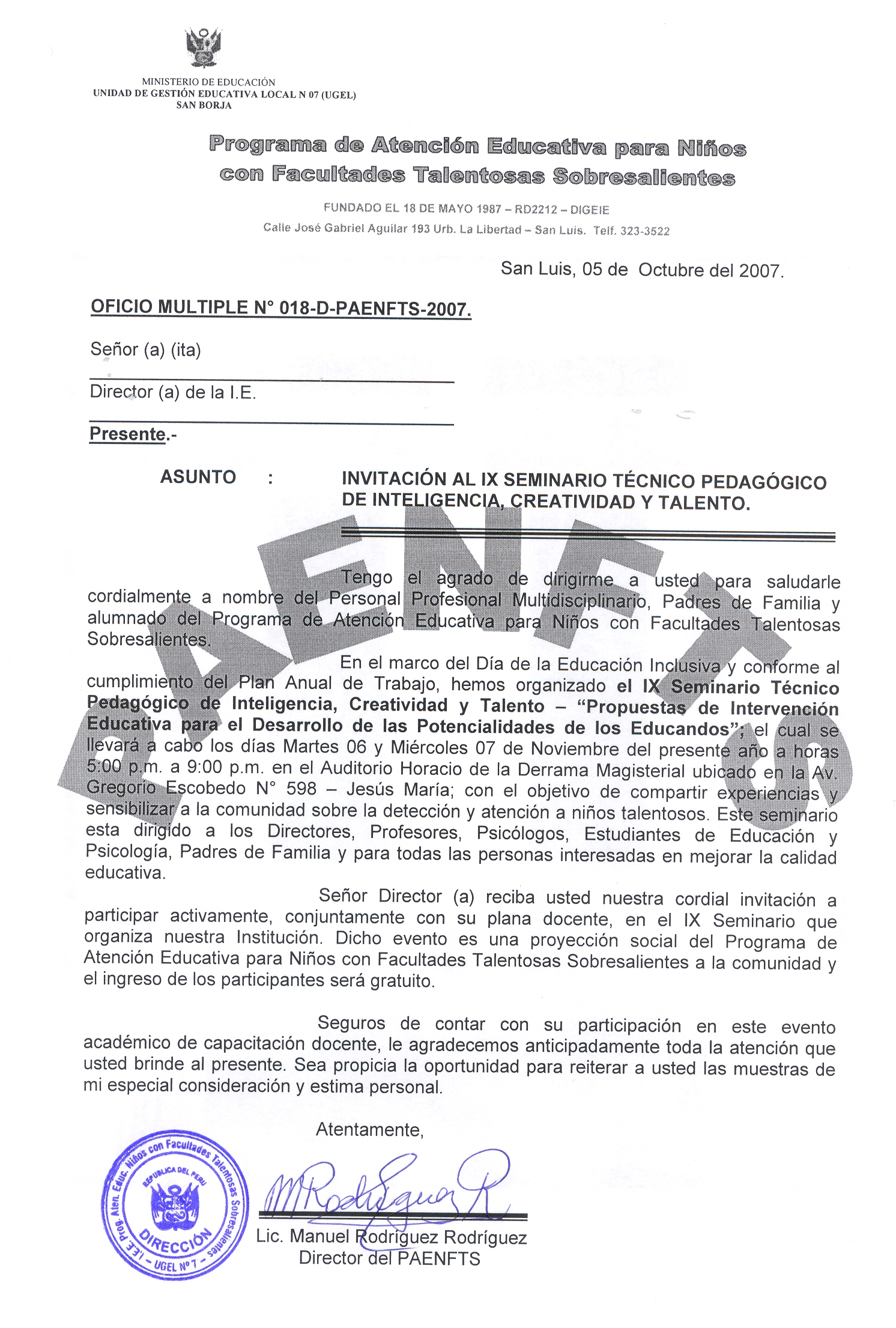 DIRECTOR DEL PROGRAMA DE ATENCION EDUCATIVA PARA NIÑOS CON FACULTADES TALENTOSAS SOBRESALIENTES (P.A.E.N.F.T.S. PERU) PALMAS MAGISTERIALES DEL PERU AÑO 2005, EN EL GRADO DE EDUCADOR