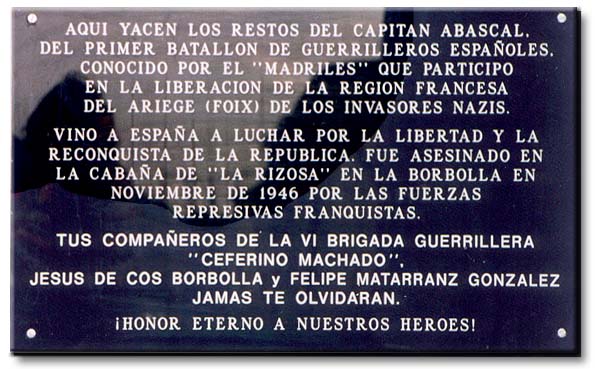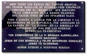 Por esto me propuse, personalmente, identificarlos nominalmente con esta humilde placa de recordatorio, para lograr sacarlos del anonimato, donde los sepultaron los dirigentes políticos que pactaron con franquistas y neofranquistas la tan cacareada y modélica Transición democrática. De esta Brigada rescatamos en nuestra Agrupación guerrillera Ceferino Machado, (nombrado Comandante a título póstumo) a cuatro, entre los que se encontraba Madriles enterrado en el cementerio de La Borbolla, donde le hemos puesto tambien una placa identificativa. Además tengo que señalar que en este recinto reposan los restos de Ceferino Machado, Francisco Bedoya, Pin El Cariñoso, Dolores Lavin Lola. Marcos Lavin El Melenas y Pedro Lavin El Cenizo. De estos últimos se desconoce el lugar donde están enterrados. A todos ellos les hemos dedicado una estela en el monumento de Camargo, en el Parque de la Ría, a donde quedais todos invitados esta tarde a las 6, donde estarán presentes las autoridades locales de Camargo." ------ ------ Poema de Antonio Casares Un Lugar para los Héroes: Nada es la nada cuando el ser perdura más allá de los límites humanos / porque los sueños nunca serán vanos ni sombras de una vaga conjetura./ Lucharon contra una dictadura por el sueño de ser republicanos: no soportaban yugos de tiranos,/ ni leyes que dictaba la impostura./ En tiempos de penuria y de zozobra,/ nos dejaron las huellas de su obra, prefirieron morir a estar cautivos./ Son héroes que murieron como hombres./ No quedarán anónimos sus nombres:/ En nuestros corazones siguen vivos. Ciriego, 1 de septiembre de 2002, Antonio Casares |