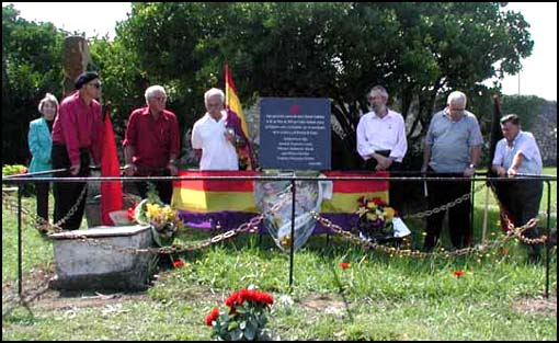 Discurso de Jesús de Cos: "Como sabréis todos, hoy 1† de septiembre, hace 63 años que los nazis invadieron Polonia, preludio que dio lugar a la ocupación de las tres cuartas partes de Europa, que costaría la bagatela de 60 millones de muertos, y precisamente este mismo mes, el día 27, se cumplirán tambien 27 años de los fusilamientos de cinco antifascistas del FRAP en Madrid. En primer lugar tengo el honor de presentaros hoy aquí a los siguientes representantes de las Asociaciones antifascistas y republicanas. A mi derecha, Dolores Cabra, Secretaria General de AGE (Archivo, Guerra y Exilio), Marie Panabiere de la Asociación FREE (Hijos e Hijas de Republicanos Españoles en Francia) y que representa además a la Coordinadora MAGE de Asociaciones hispano-francesas que luchan por la recuperación de la Memoria Histórica y Juanita Prieto, Presidenta de la Asociación VASNIGUE, (Niños de la Guerra del País Vasco). Está tambien Felipe Matarranz, Capitán Lobo del ejército republicano y Coordinador de la VI Brigada Cántabro-Astur Ceferino Machado, así como Nicanor Rozada, enlace de la guerrilla en Asturias y se ha adherido tambien a este acto el Profesor Jesús Gutierrez Flores, autor de un libro sobre las víctimas de la represión franquista en la zona de Campoo, que está preparando otro de toda Cantabria, con amplia y detallada documentación. ¿Por qué nos encontramos hoy aquí delante de estas tumbas, donde yacen estos héroes internacionalistas relegados al olvido?: porque ya es hora de que despertemos del letargo y empecemos a exigir la rehabilitación de las víctimas de la represión y sobremanera, porque estos compañeros de lucha que están aquí fueron, y para mi siguen siendo, de los que decía la Pasionaria que eran como el acero, que se doblaban pero no se quebraban. Lucharon durante la epopeya de la guerra civil española de liberación nacional y siguieron el combate contra el nazifascismo invasor en Francia durante otros cinco años más. Aun no conformes con esto, vinieron aquí a ayudarnos en las guerrillas, a combatir contra las hienas franquistas, entre ellos estaba el Comandante Gabriel Pérez Díaz, considerado en Francia, como Cristino García, héroe nacional. |