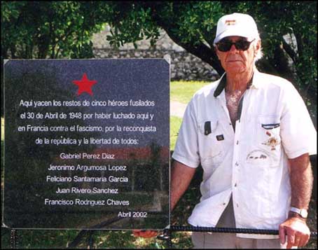 El delegado de A.G.E. en Cantabria, Jesús de Cos Borbolla, Comandante "Pablo", nos ha comunicado que se ha erigido una placa identificativa en la fosa común del Cementerio de Ciriego (Santander) dedicada a los cinco héroes guerrilleros de la Brigada "Pasionaria" fusilados en ese mismo lugar, el día 30 de abril de 1948: - Gabriel Pérez Díaz - Jerónimo Argumosa López - Feliciano Santamaría García - Juan Rivero Sanchez - Francisco Rodriguez Chaves. Por medio de estas líneas Jesús de Cos, veterano de la guerrilla antifranquista, deseó hacer un llamamiento a sus familiares o compañeros de lucha, y a todos los demócratas en general, para que asistiesen a la inauguración y homenaje que se les rindió por fin, al cabo de tanto tiempo de olvido, el día 1 de septiembre de 2002, a las 1230 del mediodía en las fosas comunes del citado Cementerio. A este acto asistió una delegación de mas de 26 Asociaciones de resistentes antifascistas venidos de la zona de Pau (Francia) de donde partieron estos guerrilleros españoles de la Brigada Pasionaria, al que acudieron M Amparo Panabiere en representación de la coordinadora MAGE que agrupa a veintiseis Asociaciones francesas y españolas que trabajan por la recuperación de la Memoria histórica, Dolores Cabra, en representación de AGE, Juanita Prieto, Presidenta de la Asociación VASNIGUE (Niños de la Guerra del País Vasco), Nicanor Rozada, que fue enlace de la guerrilla en Asturias y autor de varios libros sobre este tema, el poeta Antonio Casares que les leyó y dedicó el poema "Un lugar para los Héroes", representantes de la Asamblea de Mujeres de Cantabria, varios miembros de las Juventudes Libertarias, así como amigos y simpatizantes de AGE de la zona. A continuación el Ayuntamiento de Camargo ofreció una comida en la Punta de Parayas, con un cocido montañés, con motivo de la fiesta anual de la Convivencia de los Pueblos y por la tarde, a las 18,00 horas se realizó un homenaje ante el monumento a las víctimas del fascismo, situado en el Parque de la Ría, (Muriedas). |