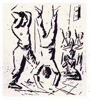 Durante tres horas estuvieron golpeándome en el empeine y dedos de los pies con tal violencia que parecian haber perdido la cabeza. Los pies engordaban por segundos hasta que empezaron a reventarse. Así continuaron golpeándome, hasta que decidieron darme de plazo para pensarlo hasta las diez, bajo amenaza de tremendas palizas. A las diez y media hace otra vez su aparición