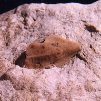 DESCRIPCIÓN: Forma en punta de flecha con un estrechamiento en la parte de atrás y con una línea central que atraviesa el ejemplar longitudinalmente. |