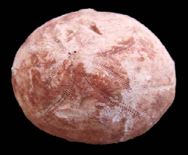 | ESTRATO: CRETÁCICO INF. | TAMAÑO: Alto, 2,5 cm y largo 3,9 cm | DESCRIPCIÓN: Erizo de contorno ovalado en el que la simetría bilateral predomina a la pentarradial. Se pueden observar los cinco ambulacros en forma de pétalos así como cuatro poros genitales en el ápice. La boca se sitúa en el centro de la cara inferior, mientras que el ano se encuentra desplazado hacia atrás (parte dcha. de la foto). |