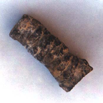 | ESTRATO: ¿NEOCOMIENSE? | TAMAÑO: 2,7 cm de largo | DESCRIPCIÓN: Entroque formado por diez artejos de forma cilíndrica. En el centro de cada uno se observa una marca en forma de cinco pétalos parecidos a los ambulacros de los erizos y en la circunferencia cortas rayas dispuestas en forma de radios. Pudiera tratarse de Austinocrinus (Ver bibliografía). |
