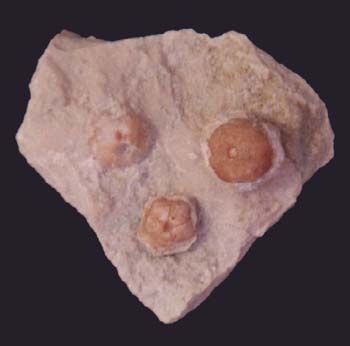 | ESTRATO: VALANGINIENSE | TAMAÑO: 0,6 cm. ( el de abajo) | DESCRIPCIÓN: Tres pequeños cálices de crinoideos de los cuales sólo puede observarse la parte inferior y el punto de unión al tallo o pedúnculo. En el situado en la parte inferior de la foto, unas líneas dejan ver su simetría pentameral, propia de todos los equinodermos. |