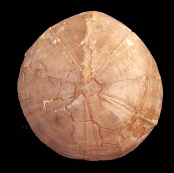 | ESTRATO: CRETÁCICO INF. | TAMAÑO: Alto, 6,1 cm y 8,8 cm de Ø | DESCRIPCIÓN: Pieza de gran tamaño para lo que se puede ver en esta zona. Dos líneas de poros pares y alargados cierran los ambulacros. En el ejemplar fotografiado no se aprecia el peristoma por estar la parte inferior muy deteriorada. El periprocto, sin embargo, se puede localizar en un lateral (no en la foto). |