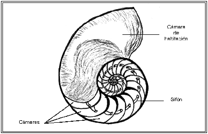 La concha del nautilus forma una espiral plana con tabiques sencillos y la cavidad orientada hacia la abertura. La situación del sifón es central, a diferencia de los ammonites que la tienen en la parte ventral. Cuando