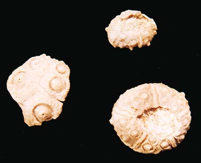 | ESTRATO: | TAMAÑO: 1,8 cm (Ø) | DESCRIPCIÓN: Erizo de forma circular y bastante plano. Tanto el periprocto como el peristoma son anchos. Las líneas ambulacrales aparecen algo sinuosas, mientras en los interambulacros se ven los gruesos tubérculos de los que partían las radiolas. |