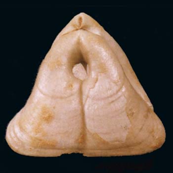 DESCRIPCIÓN: Es característica de la familia Pygopidae la forma triangular, la simetría marcada por el surco braquial y el pliegue peduncular que terminan en un orificio, la comisura prácticamente recta, el umbo corto y el foramen bien redondeado. Las valvas son convexas y lisas aunque, en algunos ejemplares, se pueden apreciar nervaduras, como en éste, o líneas de crecimiento. |