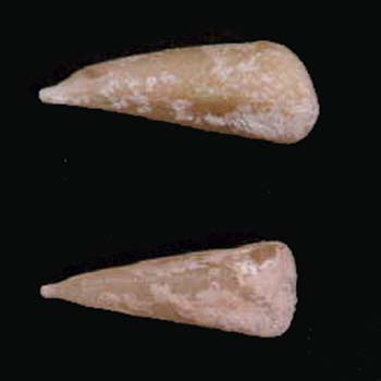 | ESTRATO: VALANGINIENSE | TAMAÑO: 3,2 cm de largo aunque las hay bastante mayores | DESCRIPCIÓN: Esta radiola, de forma piramidal con la base abombada y un fino mamelón en el vértice, no he logrado identificarla en ningún manual. Las tres caras piramidales están recorridas por unas finísimas hileras de puntos. Pueden presentar aspectos más o menos alargados. Ver ficha siguiente. |