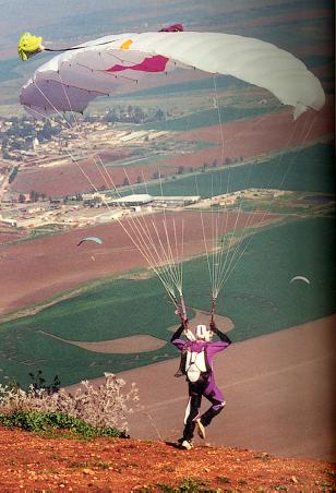 (1)起飛方式:飛行傘一定要由一個有落差的山坡上逆風起飛,藉著向前跑的速 度及風吹的速度,產生將傘翼往上