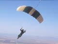 (4)外觀:飛行傘的翼展較長,形狀接近梭形。高空傘較長方形,且上方多一個小小的引導傘,在跳傘員的頭頂上