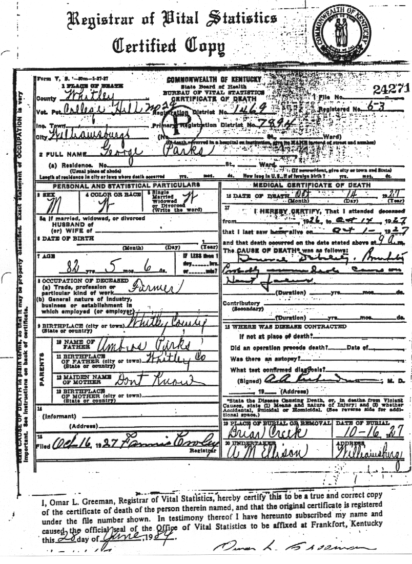 Son, George Parks Death Certificate - Image,