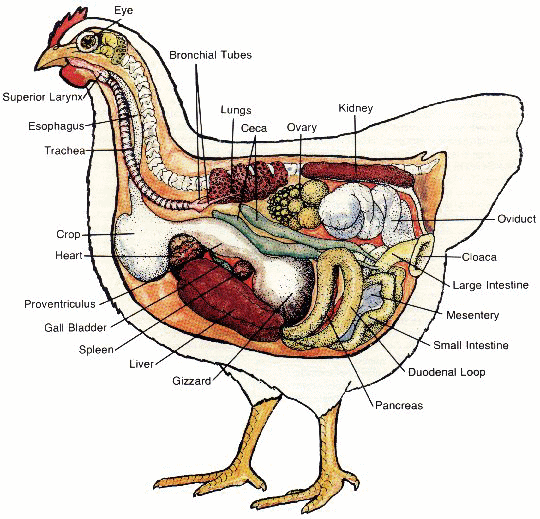 Vascular organs consist primarily of the heart and spleen. The four-chambered heart is located above the liver. The spleen is a spherical, reddish-brown organ located between the liver and gizzard. Its primary purpose is removing unhealthy blood cells, micro-organisms, and debris from the blood system.