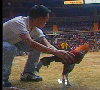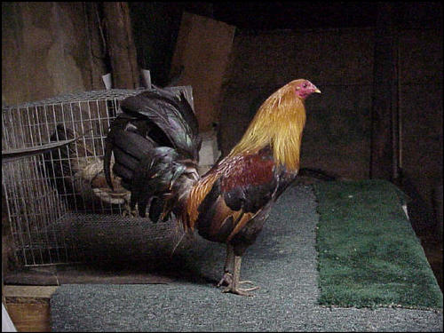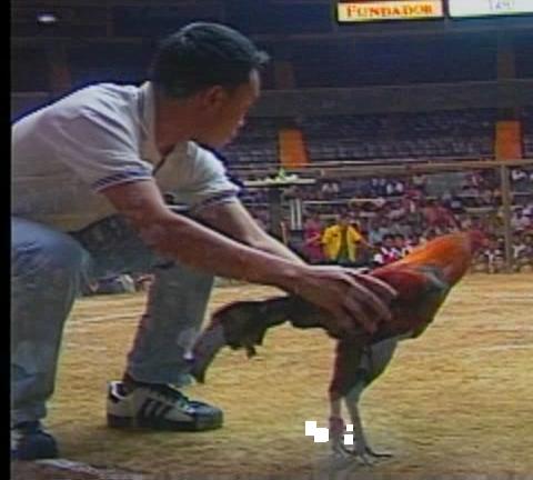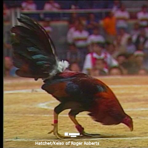 pitting this kind of roosters requires specific skill in longknife.they are not billed up heavily so as not to bring them out to uncontolled aggressiveness.they are just billed slightly to make them alert yet still calm.their weakness is in the first couple of aerial engagement where two cocks break high coming from far distance.these roosters will surely be outmaneuvered in the air by the high breakers.pitting and setting them sidewards at the far end side of pitting arena and let them walk to direction of opponent to have close distance fights will give them a better chance to win.i remember a fight where roger roberts release head to head his hatchet kelso against a bruce barnett sweater.the other pitter saw roger roberts cock struggling to get out of his hands.knowing this the other pitter release his sweater cock seconds earlier than roberts cock.the sweater gained his early momentum and met roberts cock up in the air and topped him.that was all it took to finish him.at his next fight he let the handler of thunderbird entry pit for him.roger roberts really did learn a big lesson in that longknife pitting scenario. Here is the picture of the thunderbird handler pitting sidewards one of their battleroosters in far end side of arena.