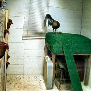 Hold the cock in its tail feathers and have him climb the board.the trick is when the cock is halfway the middle of the board that you begin slightly pulling his tail back to create slight temporary resistance in his climbing action.the cock will exert more effort in his legs and will flap his wings vigorously to climb up.the hen up in table is the motivation for the cock to climb up,they say,hahaha.