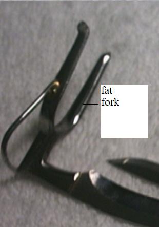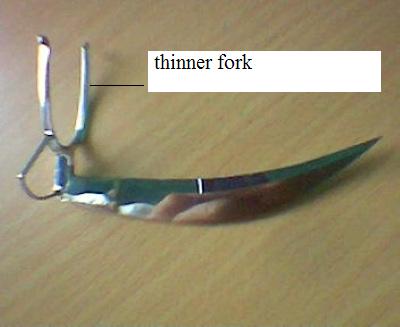 example of longknife with fat fork.from longknife experience competing purely with them i believe and in my own opinion that a long knife with thinner fork is as stable as the ones with fat fork.it all depends on the expertise of knife tyers on how to fix it properly.the lighter the weight the more easier for a cock to swing,specially in dragfight the lighter longknife has its advantage.